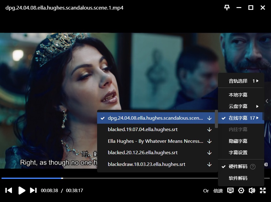 字幕:迅雷云播可在线匹配到“中上英下”,如下: