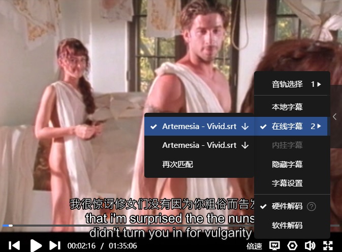 字幕:迅雷云播可在线匹配到“中上英下”,如下: